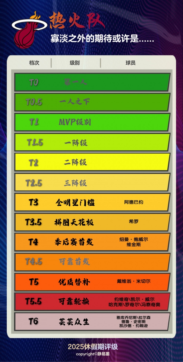 大概是不能太高的。只是,热火这些年保持竞争力的秘诀又不完全在头两号球星。热火黑八阵容的核心成员走的七七八八,不久前海史密斯也被送走了——这帮助热火的总薪资压在了税线下——然后斯波还是这支球队的教练,莱利还是总裁。你可以想象得出,下赛季热火又摸出几个奇奇怪怪的拼图,他们会在板凳席搞出名堂,拯救个别莫名拉胯的首发。他们会打附加赛,说不定会在附加赛两连胜。后面的剧情不好猜,或者给东部第一点压力,或者败得完全匹配阵容的天赋。